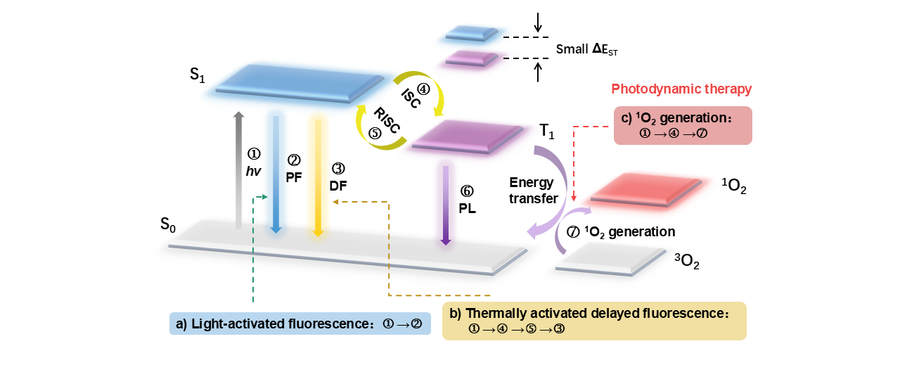 TADF机制如图所示(基态是单重态),电子从基态(S0)被光激发至激发单重态(Sn),通过系间窜越(ISC)跃迁至激发三重态(Tn),由于第一激发单重态(S1)和第一激发三重态(T1)的能级较小,这部分电子又有可能通过反系间窜越(RISC)跃迁至Sn,最后通过单重态的辐射通道返回至S0。此外,在这个过程中存在多个能量的竞争路径(例如:荧光发射、磷光发射和能量转移),因此对于功能分子合理设计是使分子能够发射TADF的重要因素。